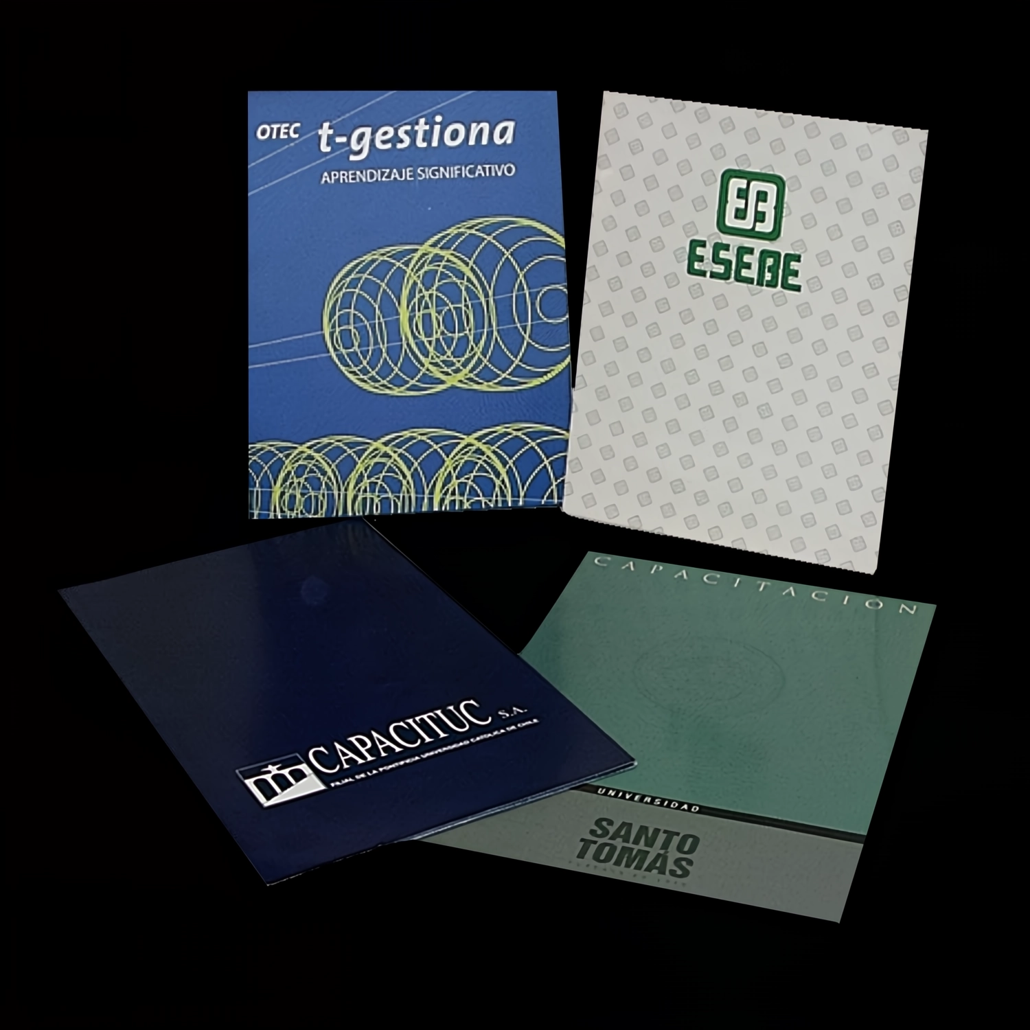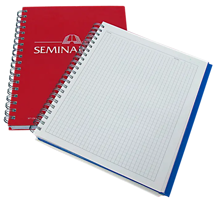 Tapas duras emplacadas para agendas y cuadernos corporativos. Papel interior bond de 80 gr. Cuadriculado impreso. Anillado metálico doble cero.