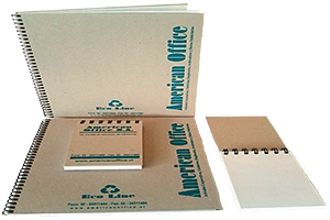 Cuadernos con tapa de cartón reciclado de 1,8 mm. Hojas interior impresas. Anillado metálico doble cero con su logo impreso en serigrafía.